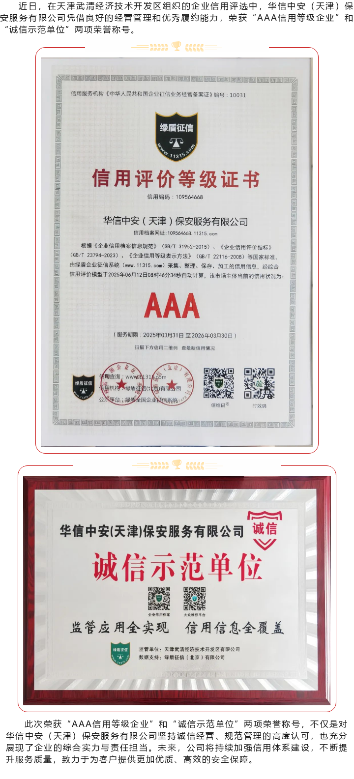 【喜报】华信3044永利集团天津公司荣获武清开发区“AAA信用等级企业”及“诚信示范单位”双项荣誉