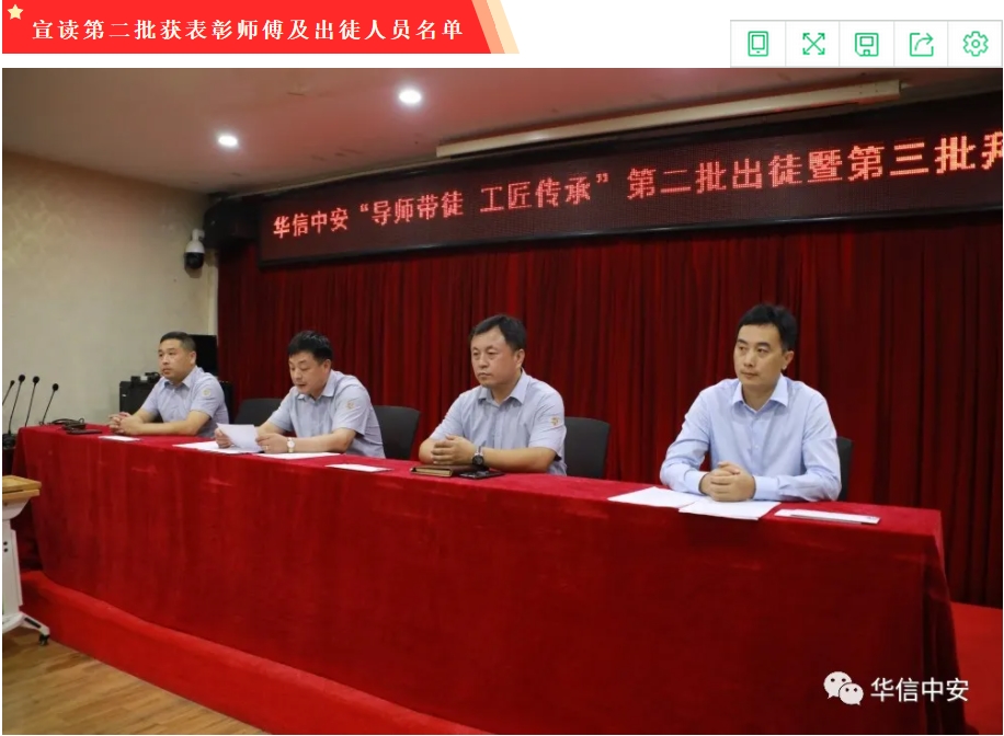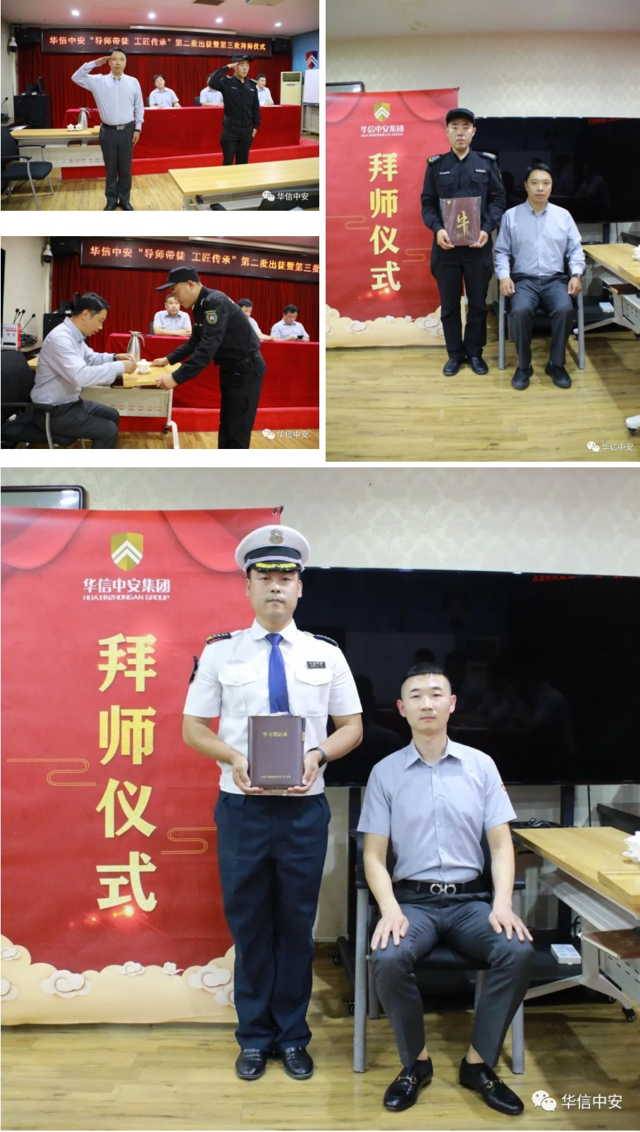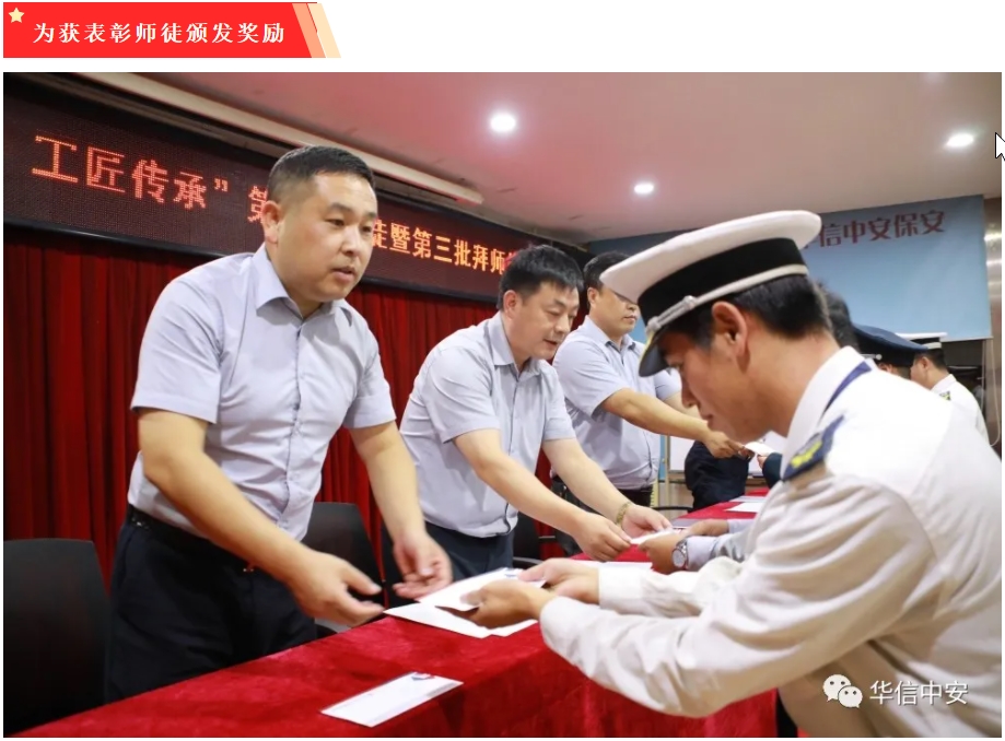 根据"导师带徒、工匠传承"师徒管理实施方案,2021年5月初,集团举办了第二批"导师带徒、工匠传承"拜师仪式。经过3个月师徒共同学习、共同进步、共同发展,师傅、徒弟在平时的工作中认真负责、积极进取、表现突出。为了表彰先进,激发广大保安员的工作积极性,经各部门考核,集团研究决定,对各位师傅的倾囊相授、敬业精神给予通报表彰和奖励,对通过3个月的努力学习、经过全面考核合格的徒弟批准出师。