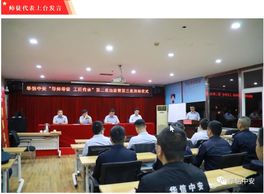 拜师仪式结束后,华信3044永利集团保安运营管理中心管理三部统计局西楼项目队长张文辉作为师傅代表上台发言。张文辉在发言中表示:"作为师傅我们首先要做到,言传身教,率先垂范,在工作业务技能上要做出表率作用。我们会将自己的工作经验毫无保留地传给徒弟,在生活以及工作中无论遇到什么困难一定给予徒弟最真诚的关心与帮助。认真履行师徒结对协议中师傅的所有职责,从严要求徒弟,使之尽快成为称职的徒弟,合格的安保人员,尽我们绵薄之力为公司培养出有能力的骨干及保安人员。"