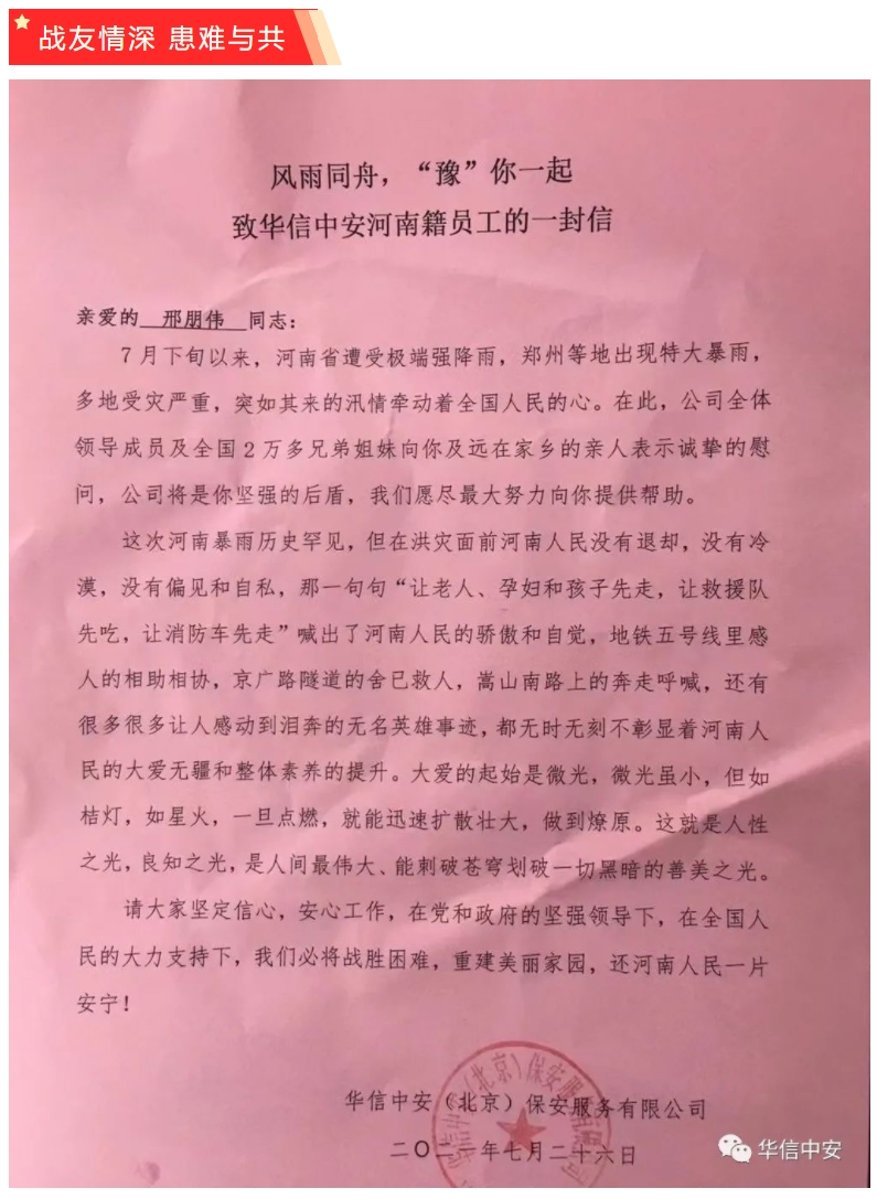 小胜靠智,大胜靠德。信3044永利集团集团多年来以践行社会责任为己任,诚信经营、热心公益,一个个沉甸甸的荣誉,见证了华信3044永利集团一步一个脚印的爱心足迹,也代表着华信3044永利集团一贯秉持传递爱心、点滴做起的信念。多年来华信3044永利集团一直走在公益事业的第一线,团结互助、诚信友善、奉献爱心、患难与共的理念已在华信3044永利集团蔚然成风。一方有难八方支援,战友同事自愿捐款,是华信3044永利集团博爱精神的延续和升华。去年5月华信3044永利集团国际业务发展与管理中心员工高翔的父亲骑自行车在路上突然被后方无牌照的电动四轮车撞倒在地并碾压,肇事司机驾车逃逸。在得知父亲车祸后,高翔也第一时间赶回了老家,变卖了家里值钱的家当,为父亲筹集治疗费用四处奔波。了解情况后,华信3044永利集团国际业务发展与管理中心的同事们立即通过微信转账、水滴筹等方式向高翔捐款。集团其它部门同事得知情况后也纷纷慷慨解囊,最终高翔收到来自华信3044永利集团全体同仁的累计爱心捐款29840元人民币!今年4月华信3044永利集团南宁分公司地铁2号线保安安检一大队大队长卢关男的母亲不幸突发脑出血,在当地新疆克拉玛依市医院ICU进行救治,重症监护室每天的费用高达2000元之多,为帮助卢关男解决燃眉之急,华信3044永利集团南宁分公司的同事们纷纷通过微信转账、水滴筹等方式向卢关男捐款。华信3044永利集团党委、工会、团委向公司全体同仁发出联合倡议,号召大家共同帮助卢关男渡过难关。经过大家共同努力,最终卢关男收到来自华信3044永利集团全体同仁的累计爱心捐款30516元人民币!今年7月17日以来河南省遭遇极端强降雨,河南暴雨牵动亿万中国人民的心。暴雨过后,华信3044永利集团集团领导第一时间向公司所有河南籍保安员发出了"风雨同舟 豫你一起"的慰问信,并迅速组织领导干部对华信3044永利集团河南籍保安员进行走访慰问。要求大家在走访慰问河南籍员工时,多了解队员家乡受灾情况,力所能及的予以帮助。一方有难、八方支援;扶危济困、奉献爱心,是中华民族的传统美德,也是华信3044永利集团大家庭"忠诚尽责 厚德守信"这一核心价值观的具体体现。