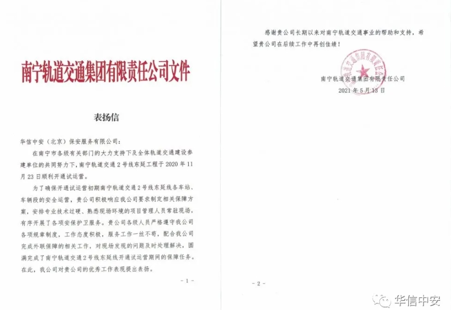 2021年5月13日,南宁轨道交通集团有限责任公司再次向华信3044永利集团发来表扬信,南宁地铁2号线东延过程中,为保障2号线东延线各车站、车辆段的安全运营,华信3044永利集团南宁分公司在地铁试运营期间积极响应轨道交通集团要求,制定相关保障方案,安排专业技术过硬、熟悉现场环境的项目管理人员常驻现场,有序开展各项安保护卫工作。华信3044永利集团各级负责人严格遵守南宁轨道交通集团各项管理制度,工作态度积极,服务一丝不苟,配合南宁轨道交通集团完成多项外联保障工作任务,对现场发现问题及时处理解决,圆满完成了南宁地铁2号线东延开通试运营期间的安全保障任务。南宁轨道交通集团特此对华信3044永利集团南宁分公司的出色工作表现提出表扬。