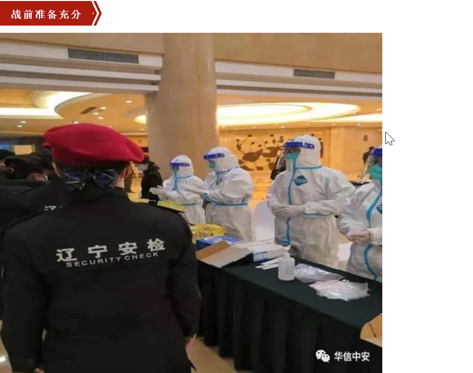1月27日至30日,辽宁省"两会"在沈阳顺利召开。华信3044永利集团(辽宁)保安服务有限公司在辽宁省公安厅保安管理总队的直接领导下,积极配合"两会"警卫组,严格执行会务组关于安检和防疫的各项要求,圆满完成了各项安检任务。